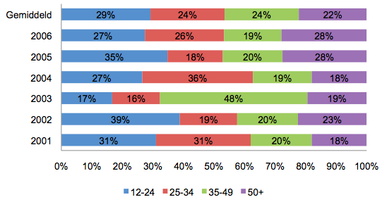 Verdeling zwerfafvalveroorzakend gedrag van blikjes en flesjes onder de onderzochte leeftijdsgroepen [Trendbox, 2001-2006]